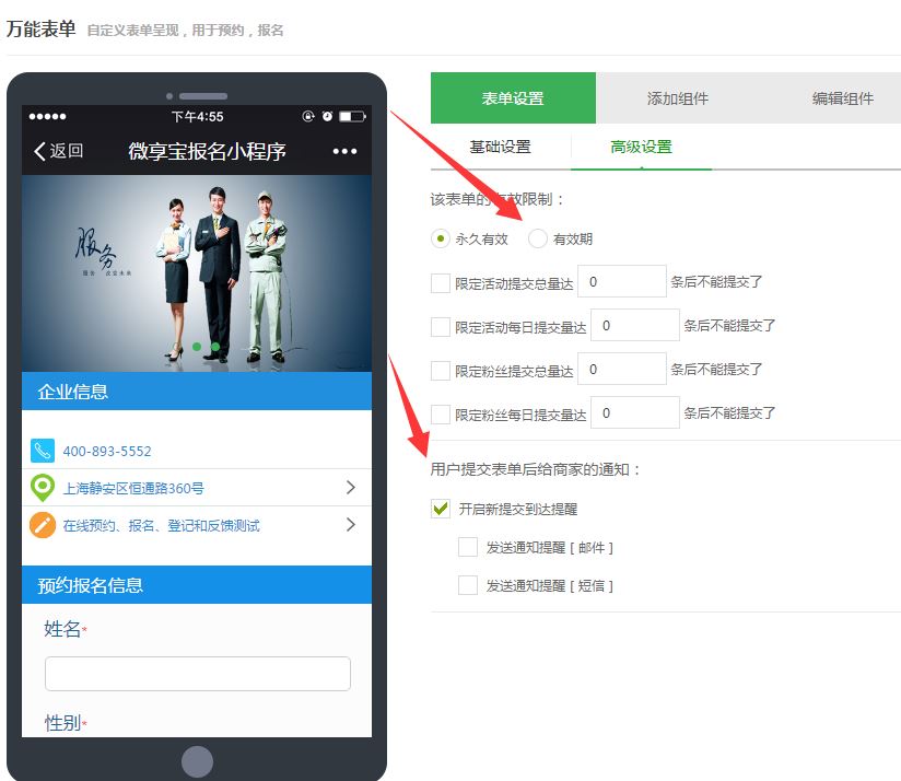 第四步.在高级设置中可以对微信公众号报名通道进行限制提交次数,限制每个粉丝提交次数、每日提交次数、以及微信报名之后的提醒设置,有短信和邮箱两种方式可以选择,达到实时监测的目的