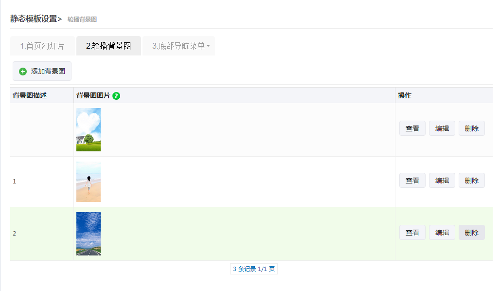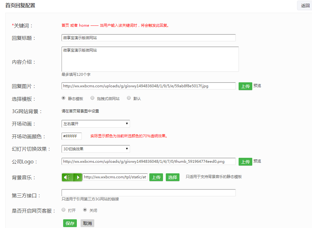 最后一步:静态模板设置,选择首页幻灯片 或者 背景轮播图,保存以后一个微官网就制作成功了
