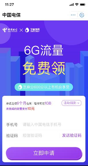 在活动页面填写电信手机号(必须连续6个月在网 每个月领1G流量 否则需要支付10元)