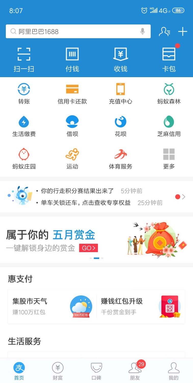 1、我们进入支付宝后可以看到顶部有搜索栏,我们点击搜索栏。