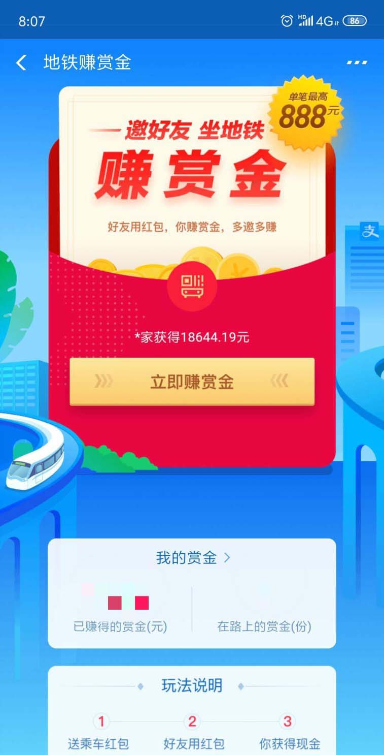 支付宝有很多推广活动,邀请好友坐地铁也可以获得赏金,该怎么邀好友坐地铁赚赏金呢?详细请看下文介绍。