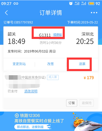 2、然后选择刚刚后面的候补票车次,选中下方有个 退票按钮