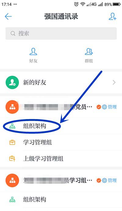 4、在“强国通讯录”页面。找到要更改学习组织的学习者现在所在的支部,在下面找到“组织架构”单击