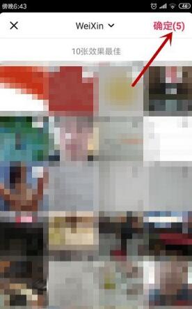 下载好模板后会打开手机相册,选择照片,这里最好选择十张最佳,选好后点击【确定】。