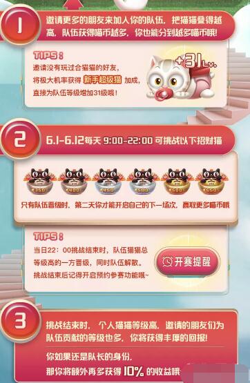 2019年6月1日-2019年6月12日每日9:00-22:00,“理想猫大赢家”主界面会开放叠猫猫大挑战互动。