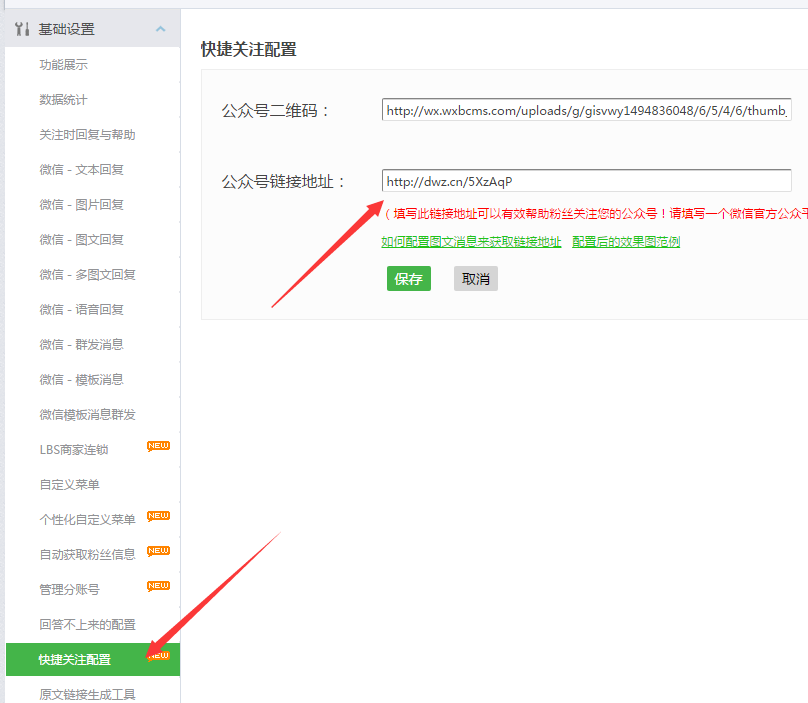步骤二:在基本设置-快捷关注配置中,填写信息好微信公众号的关注连接,这一步设定好是以便人们下面制做公众号抽奖活动的时候扫码关注使用的;