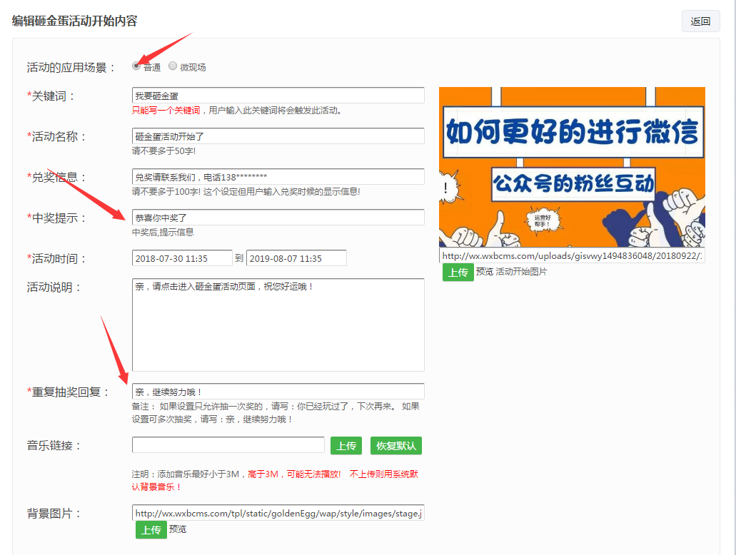 步骤三:今天给大家讲解的公众号抽奖活动就用砸金蛋的模板为示例开展解读,点一下增加砸金蛋活动进到砸金蛋主题活动编写网页页面,应用场景一般选择普通,然后就可以完善砸金蛋活动內容,大家先填写砸金蛋活动的关键字、活动名称、领奖信息内容、活动详情、得奖了提醒、主题活动说明、背景图片等基本资料,再编写抽奖活动的提醒文本。