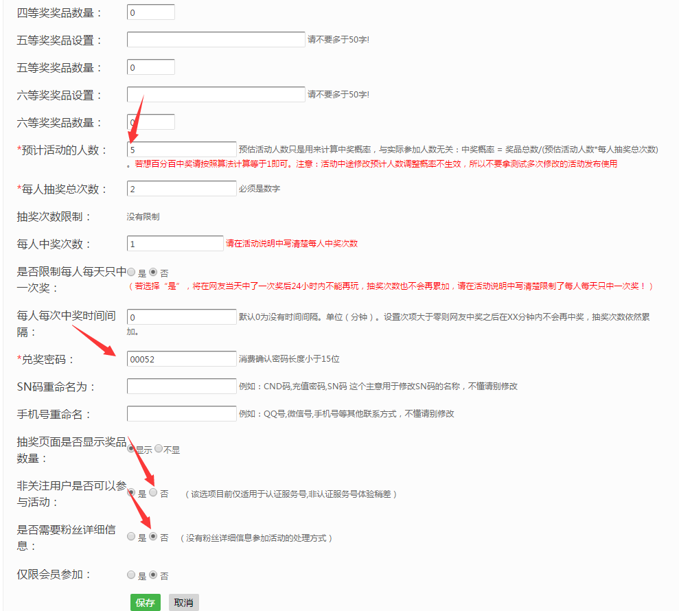 步骤四:微信公众号抽奖活动的奖项设置,我们可以6个奖都设定,还可以设定其中的某几个,只要编写奖品的名字和总数,微信公众号抽奖活动的几率是由预估活动的人数设定的,在抽奖活动次数限定这里,有每天限定、分享限定,我们可以挑选是每日能够抽奖活动还是分享以后提升抽奖活动次数,全是由自己自定义设置的,最终有一个设置是非关注客户是不是能够参加活动,这儿是控制强制性扫码关注的,我们都是要做增粉主题活动,因此这一按键是关键点否的,就是说必须粉丝扫码关注以后才能够参加活动,完成后点击保存即可.