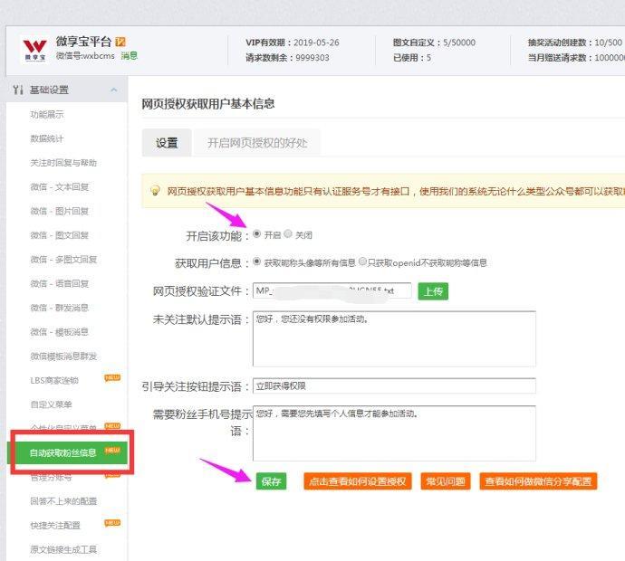 第二步,如果需要粉丝等信息,则需要在基础功能里边,将自动获取粉丝信息内容打开以后,再进行保存。然后如果要设置强制关注公众号才可参与活动,就需要将快捷关注配置点开,填写一条关注公众号的链接,最后保存就可以了。