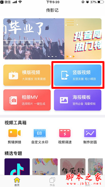2、点击打开传影记app,点击上面的“竖版视频”。