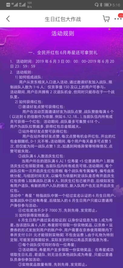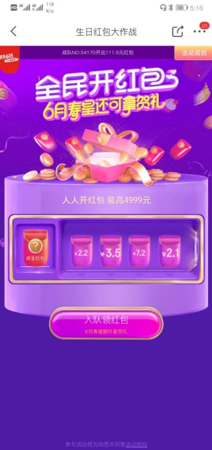 5、如果战队满6人那么可以激活庆生红包,也就是一个6月生日的寿星加上5个普通用户,每个战队只有一次机会可以获得庆生红包,寿星可以获得实物礼包,而普通用户也可以获得红包。