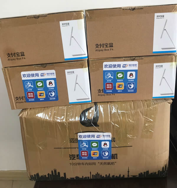 经过近个多月的市场推广,首批支付物料全用完了,就又要了一批物料,结果一到货给了我一个大大的惊喜,除支付物料外,竟然还附送了四台蜻蜓二代F4和支付盒子。因为网付是有个免费铺设刷脸支付的政策的。这可是价值上万元阿。网付渠道部的同志告诉我,因为上月,已经有四个商户满足免费铺设刷脸支付机具了,所以就一道发了过来。下面就上上实物共同分享一下喜悦的心情。
