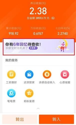 2、打开了“余额宝”详情界面之后,从活动横幅里就可以找到“时光机”的入口了(如下所示),点击即可进入其中。