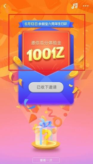 3、除此之外,在余额宝时光机查看完毕之后,我们就能够参加“瓜分100亿体验金”的活动,大家都可以试试自己的运气如何。