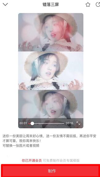 3、确认自己开通会员之后,再来点击“制作”按钮下载模板,导入手机本地的素材就可以制作出“错落三屏”的特效作品了!