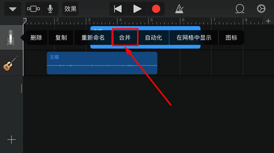 4、点击任意一个最左边音轨的图标选项,将会弹出操作栏,点击操作栏中的“合并”选项,如下图所示: