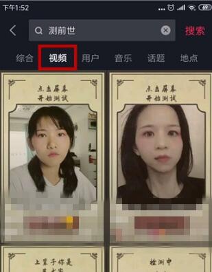打开搜索界面后搜索【测前世】,然后在搜索结果中点击【视频】下方的任意一个视频。