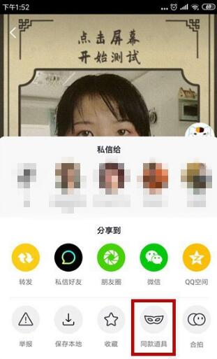 打开了分享界面后在第二排可看到【同款特效】,点击使用同款特效。