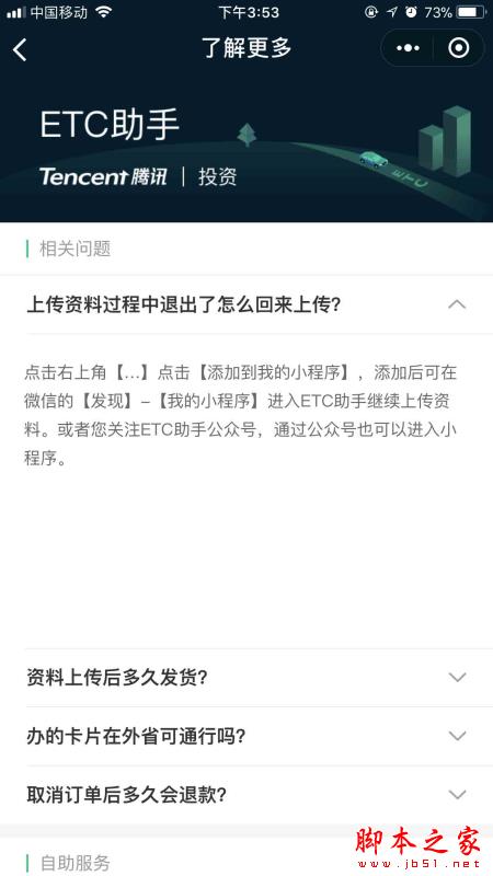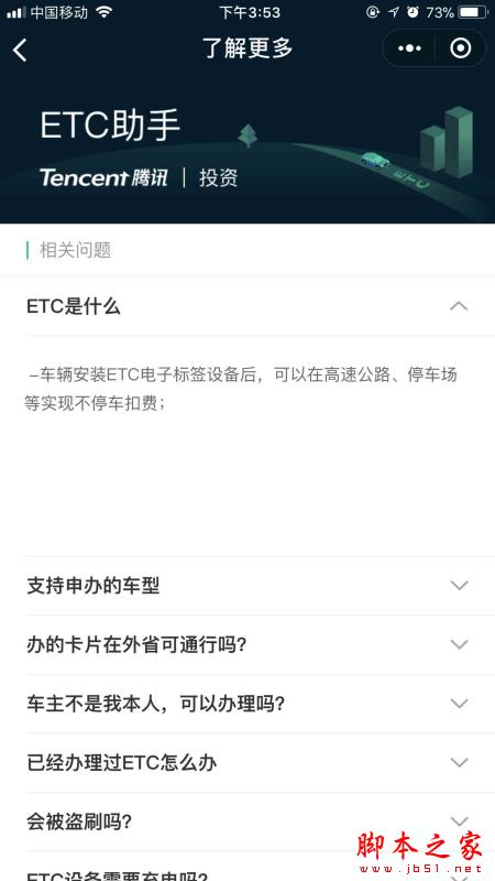 以上只是关于微信免费办理ETC的部分问题汇总。希望能够帮到你,脚本之家会持续发布更多资讯,欢迎大家的关注。