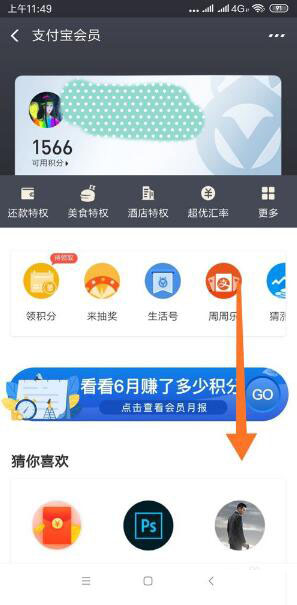 4进入“支付宝会员”页面后,将屏幕往下滑。