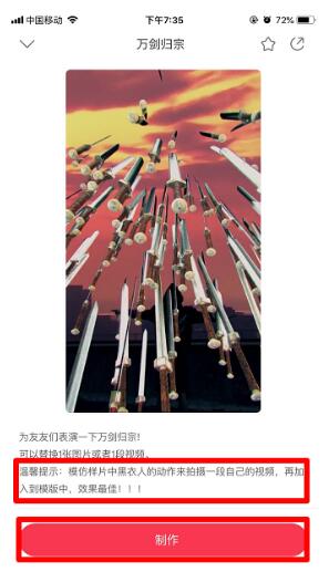 3、如此一来,再下载模板进入编辑界面,将自己拍摄的素材导入到这来,就能够制作出万剑归宗特效的视频了,非常简单。