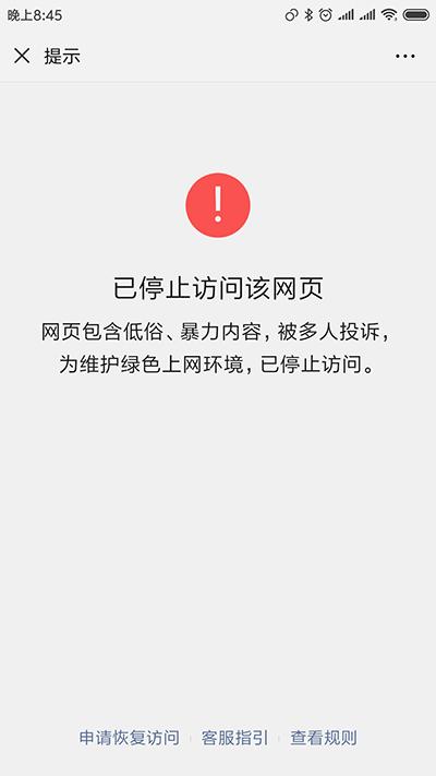 眼看已经修改完了,线上也正常了,都已经晚上9点多,准备下班回家了。就这时候,客户又反馈网站进不去了,打开一开,又**被封了,当时的心情真是想问候一下恶意举报人的全家了!没法子,继续换域名,还好之前提前备案了几个域名,没想到现在全用上了。有了上一次的经验,现在修改起来也快多了,修改上线完事都已经 10 点多了,恶意举报的人这时候也消停了下来没有继续投诉了,第二天,也就是周日。客户又反应被封了,真是头大。最开始的域名被微信封禁后,公司第一时间进行了申诉,此时收到通知,说检测后没有违规内容,就进行了解封。可能是别人恶意利用了微信的封禁系统。
