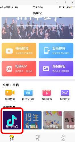 1、打开传影记,点击左下角图中所示的“热门卡点”。
