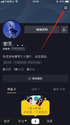 1首先,打开登录抖音之后,进入抖音的个人中心,然后点击右上角的按钮,如图所示。