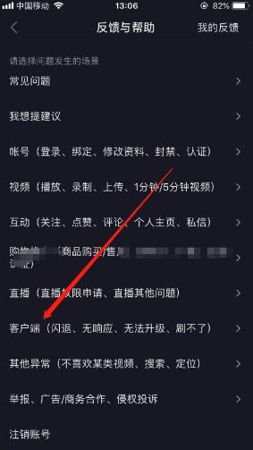 4进入反馈与帮助之后,选择“客户端(闪退,无响应,无法升级,刷不了)”,进入选择问题发生的场景,如图所示。
