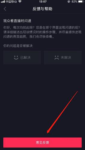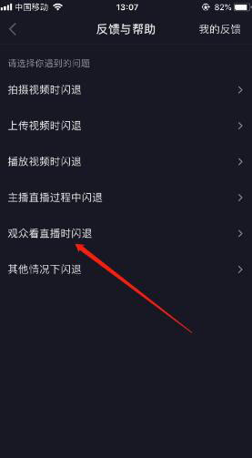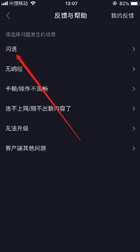 6进入闪退问题之后,选择你遇到的问题场景,比如看直播时闪退,如图所示。