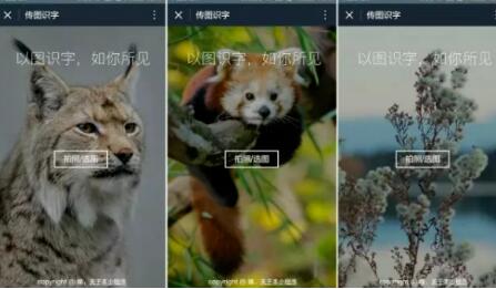 1.打开「传图识字」,你看到的是几张「慢速循环播放」的高清大图,一切风平浪静。页面上方,提有「以图识字,如你所见」八个大字,让人印象深刻。