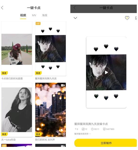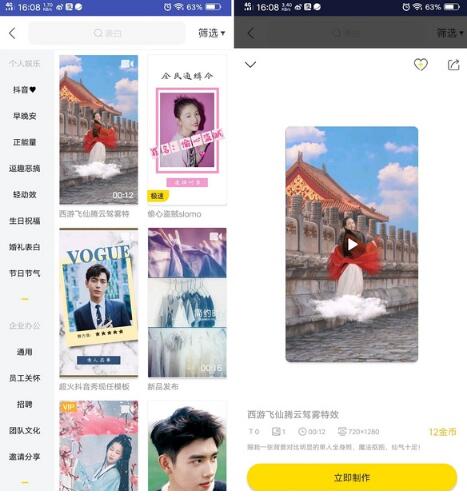 打开专题后我们可以看到非常丰富的模板,热门的卡点应有尽有,我们找到 鳌拜鳌拜凤舞九天改版 这个模板,预览时可以看下模板详情,然后我们点击制作。
