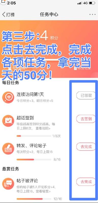 3、然后我们可以到超话的积分任务中心来获取当天的50积分,做一些简单的任务就可以完成了!