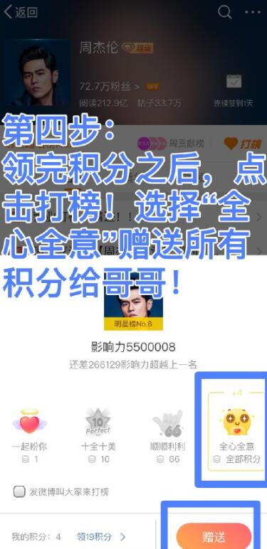 4、最后等我们一天所有可以活得的积分都获得的时候就可以到打榜界面选择全心全意这个礼物,将自己所有的超话积分都送给周杰伦了!