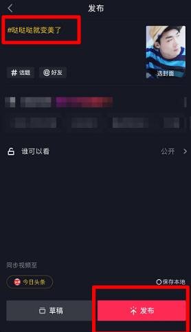 3、最后再来点击发布按钮,在编辑界面里选择“哒哒哒就变美了”话题,参加活动发布短视频就行了,无需太多操作。