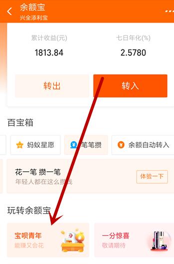 我们进入余额宝的界面之后,往下拉界面,在玩转余额宝里面就可以看到有一个宝呗青年计划,如下图所示。