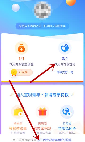 我们点击宝呗青年以后,我们可以看到我们需要完成两个任务才可以开通宝呗青年,一是余额宝有收益;二是本周有花呗支付。
