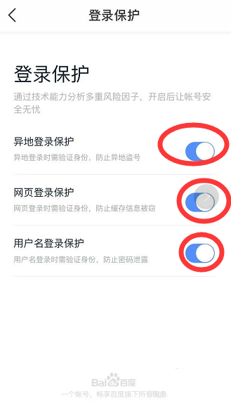 6、在登录保护界面,分别开启异地登录保护,网页登录保护,用户名登录保护