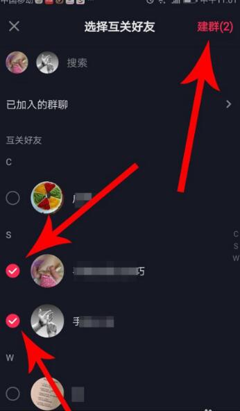 打开选择互关好友界面,勾选2个及以上互关好友,然后点击“建群”指令