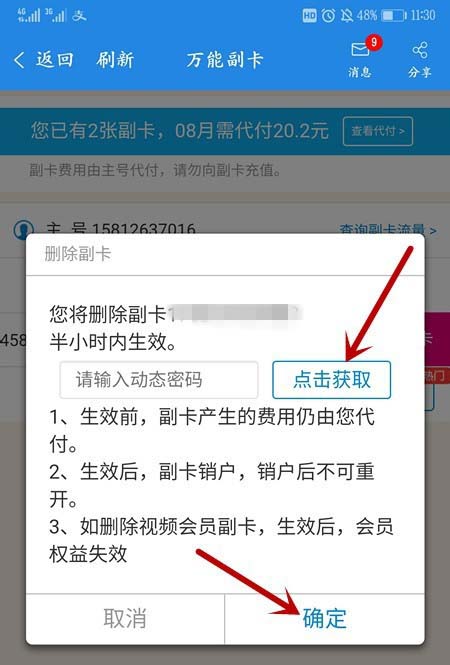 7、最后会收到一条信息,你已成功取消了这张副卡,也不能使用,也不会收费了。