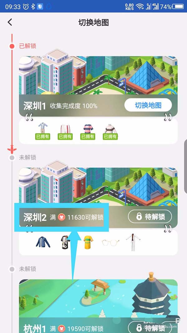 3、在未解锁的城市里面,能看到进入到下一个城市的要求,身价要达可解锁城市。如图所示