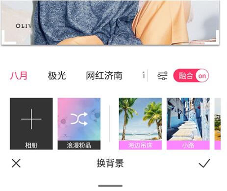 3、这里有非常多的背景模板让我们选择的,我们可以进行随机更换,如果手机里有合适的也可以点击相册进行添加。并且可以开启融合选项,这样会让新背景跟原图更加契合。