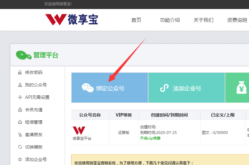 下面先给大家看一下实际微信大转盘小程序的页面,用户再用工具制作这种抽奖的时候,可以自定的决定幸运大转盘的奖励、品牌的嵌入,甚至是打开强制关注等功能,好啦,空话不多说,下面分享具体的方法,制作微信公众号大转盘小程序需要采用的工具有微享宝制作平台,任何类型的微信公众账号都可以制作,首先大家找到微享宝平台,并且申请注册了相应的操作账户之后绑定好公众号,完成直接进入后台界面中心。