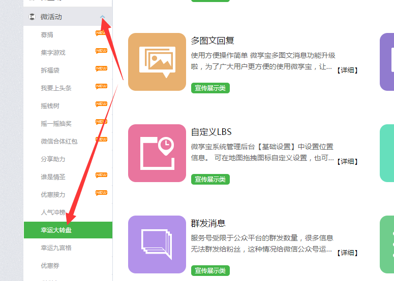步骤二:网站后台的分类管理是已经分好的,随后在平台上选择常规微活动,找到自己喜欢的抽奖游戏进行建立,已微信大转盘小程序为大家做下演试,点击新增幸运大转盘活动,对活动进行制作编辑。