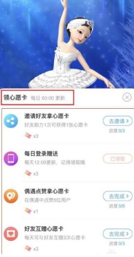 4、而且好友之间可以互相赠送心愿卡,每天赠送三次就可以获得3张心愿卡奖励。