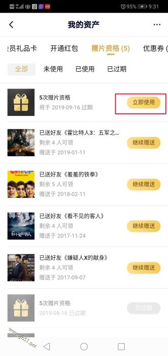 2、点击VIP会员——我的资产——赠片资格——立即使用