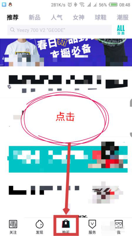 毒app中的商品,不是所有的都可以进行砍价,在打开毒app主页后,点击底部的“购买”菜单