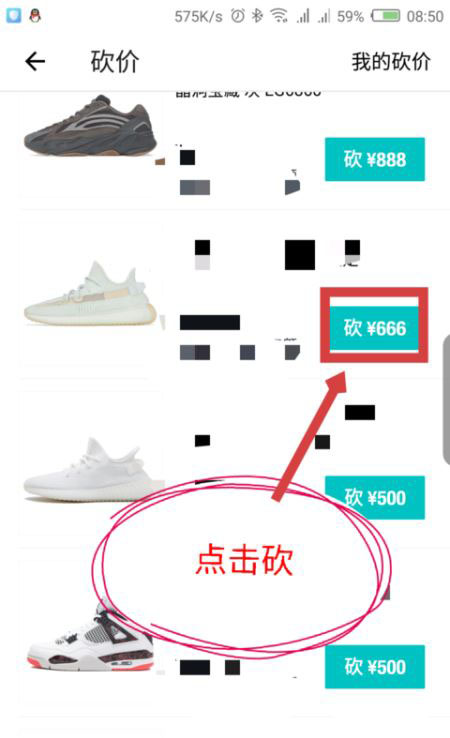 会打开砍价界面,上面的都可以砍价,点击商品后面的砍字。如图所示