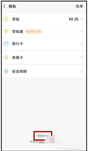 3、进入到钱包界面,点击的【帮助中心】选项,