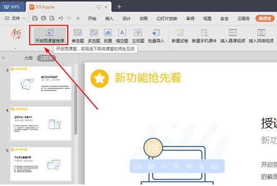 2、回到雨课堂电脑版的界面,进入雨课堂后点击左上角的“开启雨课堂授课”选项,即可开启雨课堂,实现线下实体课堂的师生互动,如下图所示: